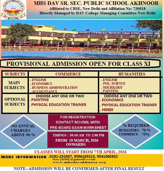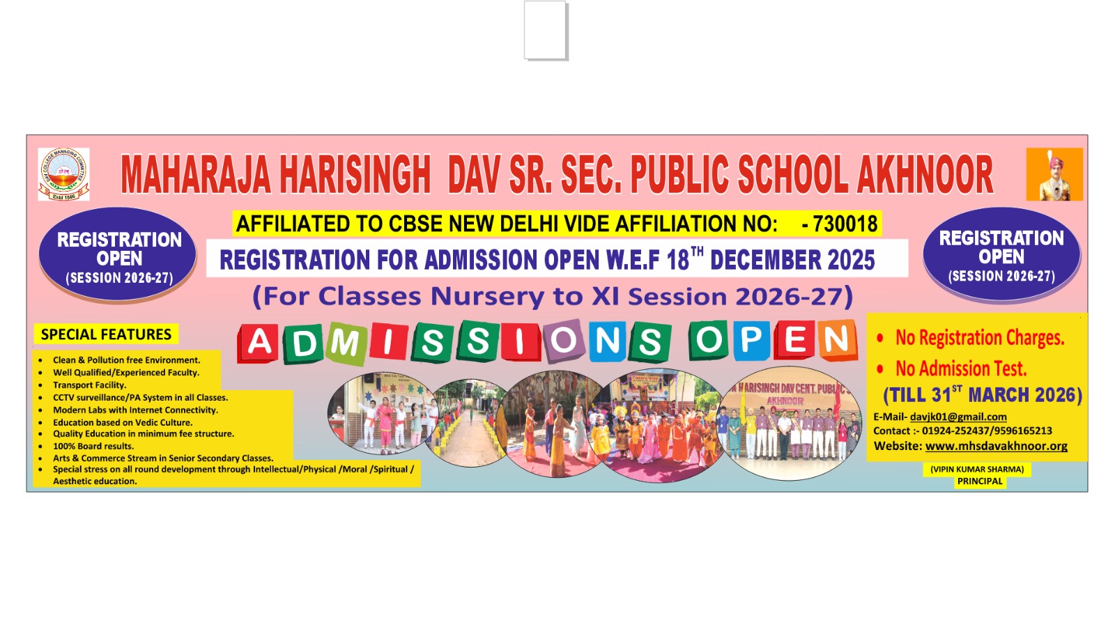 Maharaja Harisingh DAV Sr. Sec. School Akhnoor, Jammu & Kashmir-182101 E-Mail :- davjk01@gmail.com Website:- mhsdavakhnoor.org Phone :- 01924252437, 9596165213